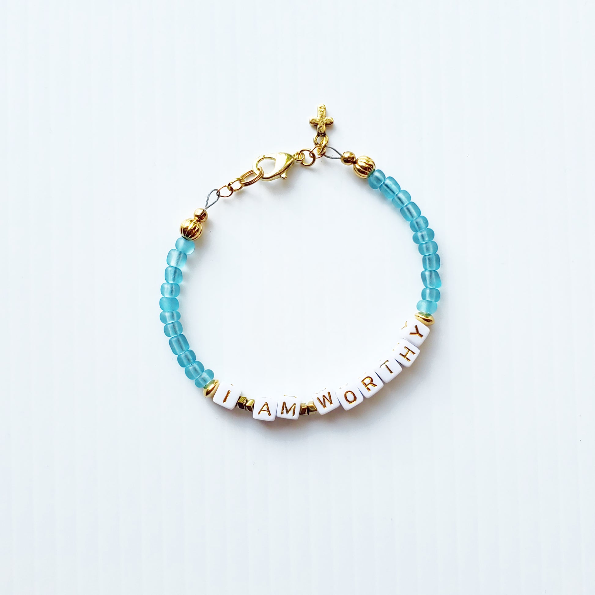 Aqua and gold single strand stackable Word bracelet