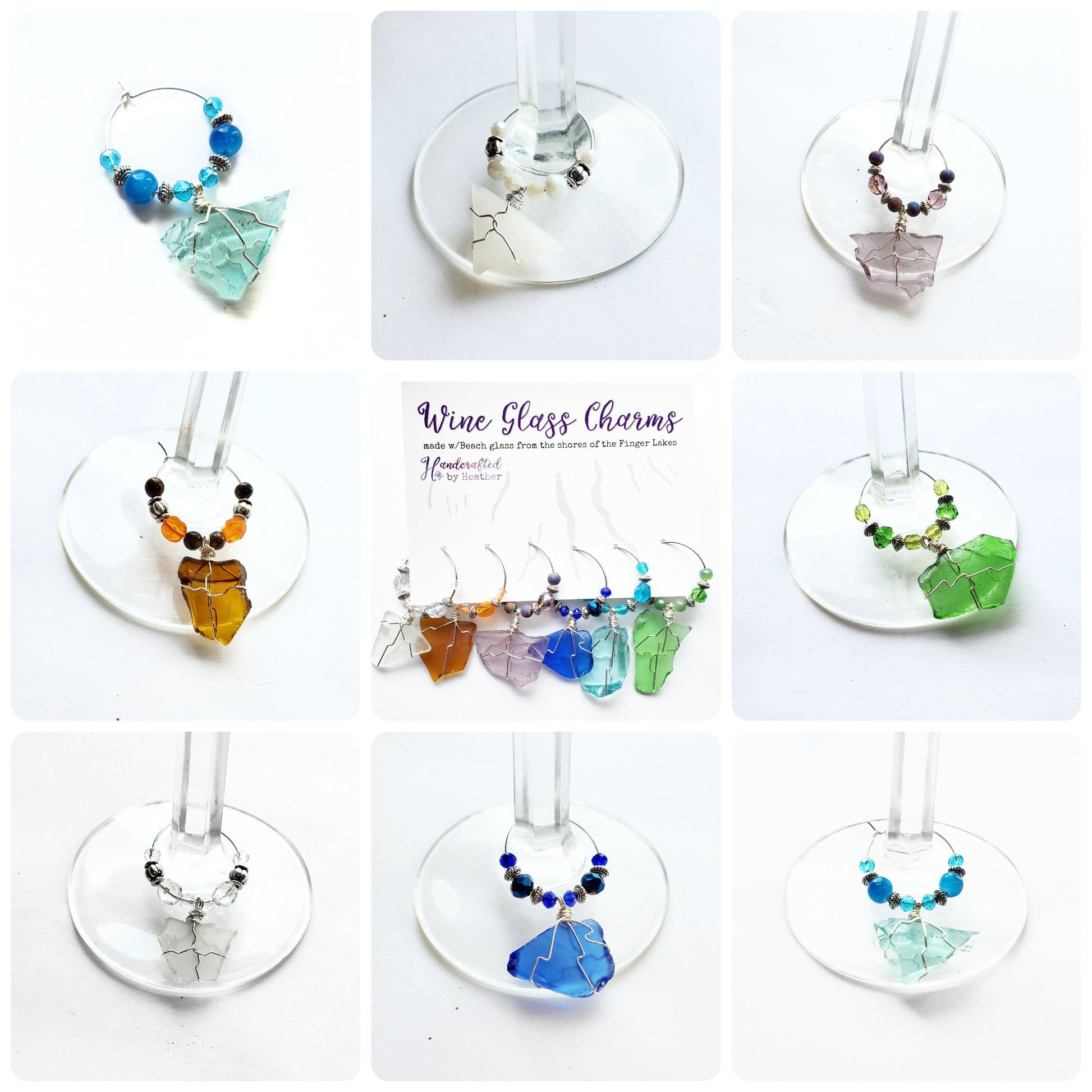 These unique wine glass charms are made with Genuine Finger Lakes Glass handpicked out of Cayuga Lake in Upstate New York, United States. I added Swarovski crystals, glass pearls, or shells to match the natural color of the glass. You'll receive 4 or 6 wine charms.