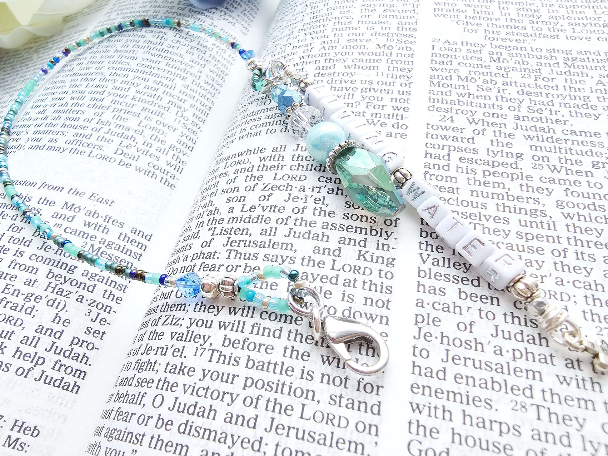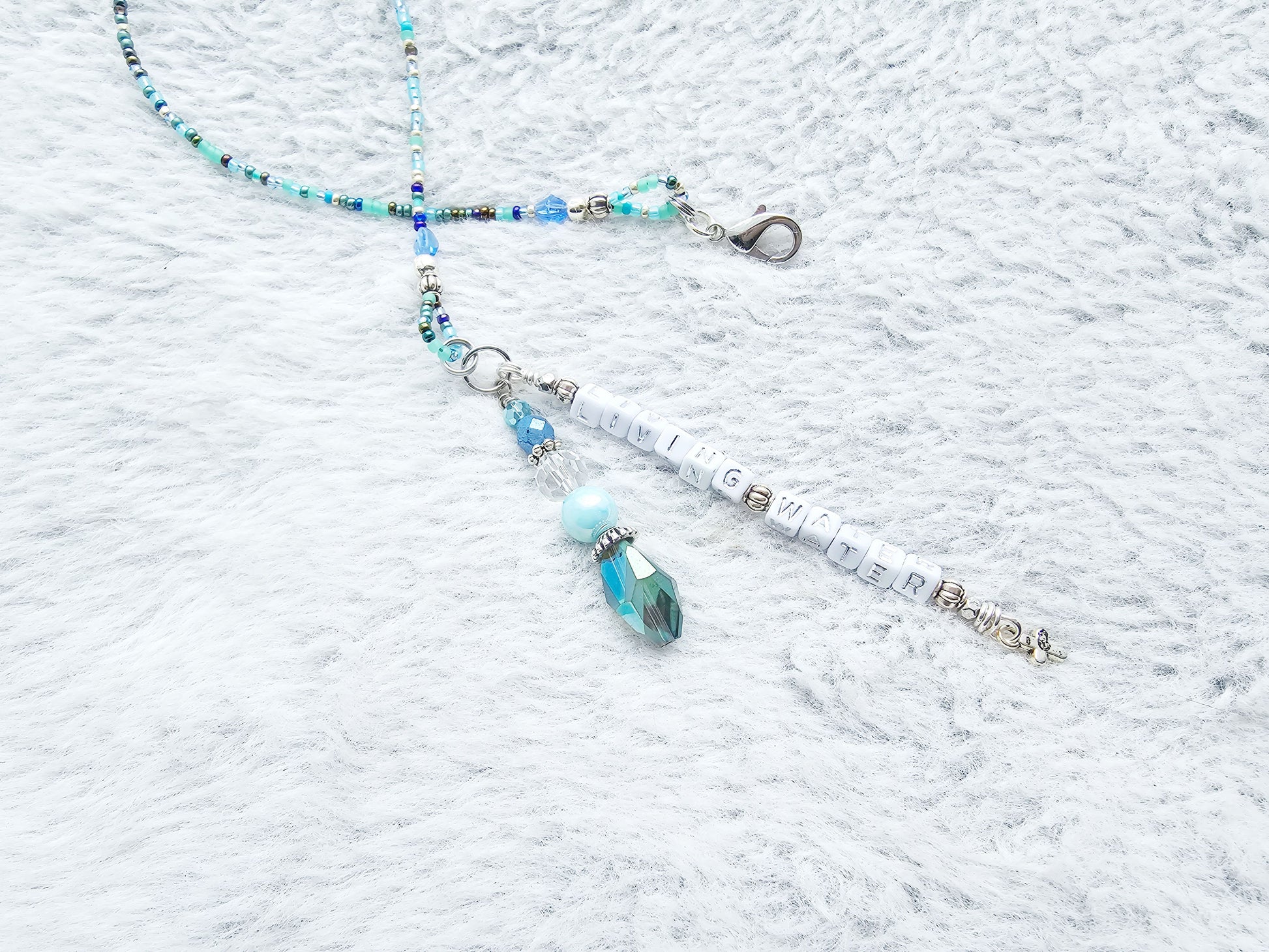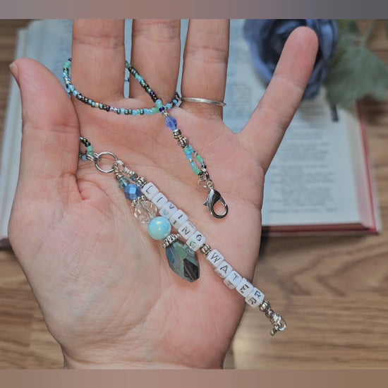 ♥ The word charm reads Living Water with white acrylic beads and silver lettering. The strands are made of a mix of blues, turquoise, and silver Czech Glass seed beads, and the charms are a mix of glass beads, silver beads, charms, and silver wire. The findings are all silver.