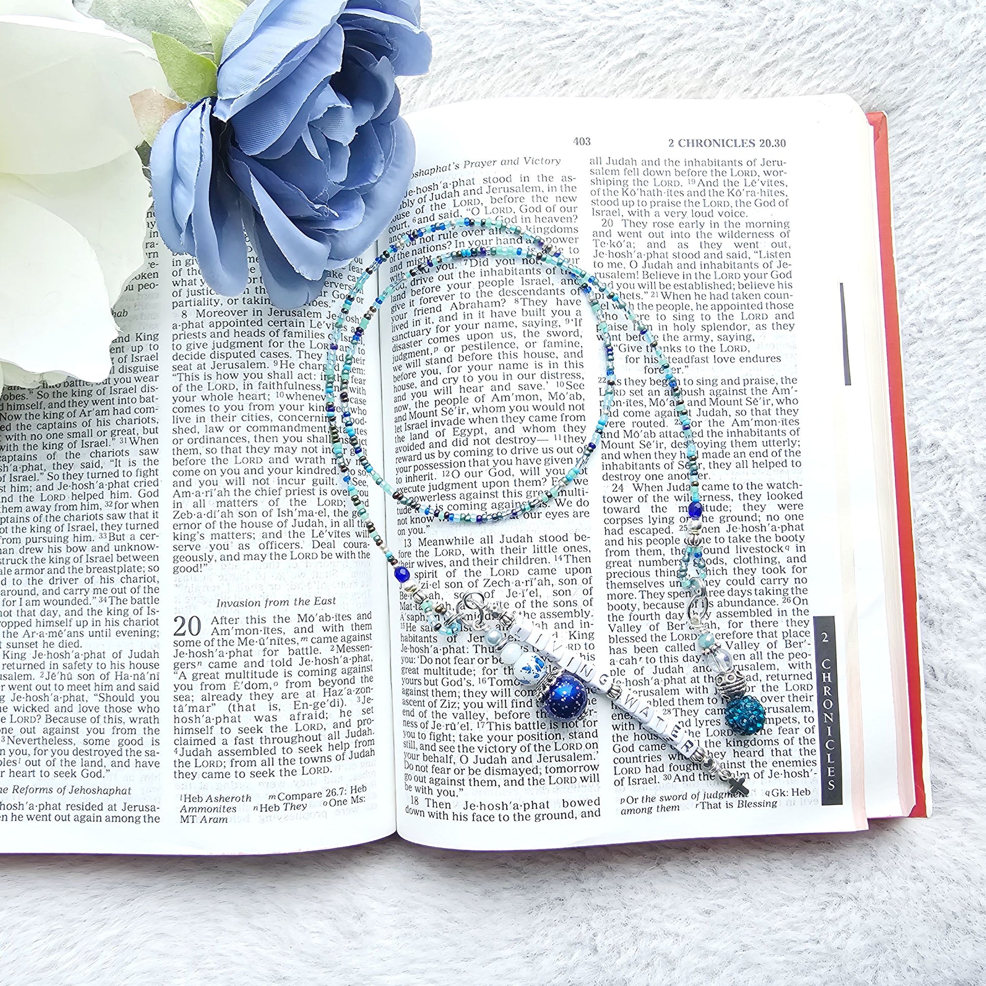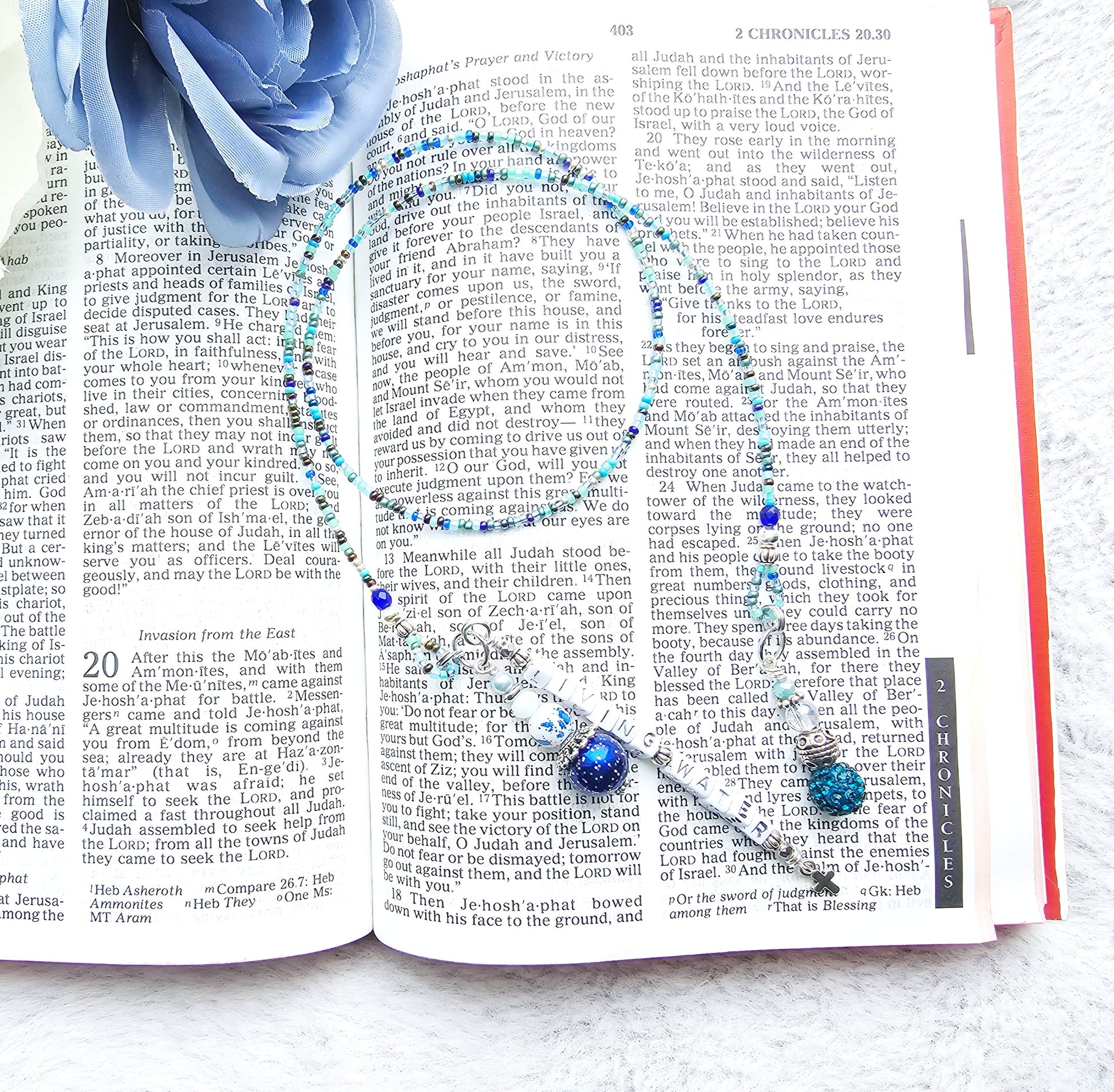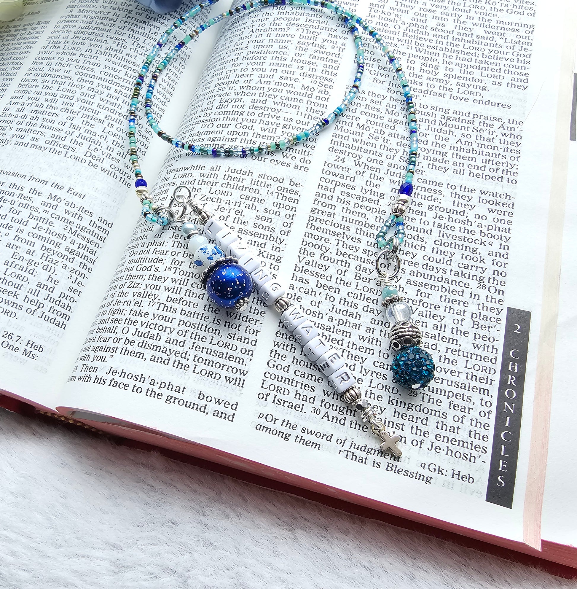 Beaded Bible Single strand Bookmark - The Living Water - Blue and silver bible accessories