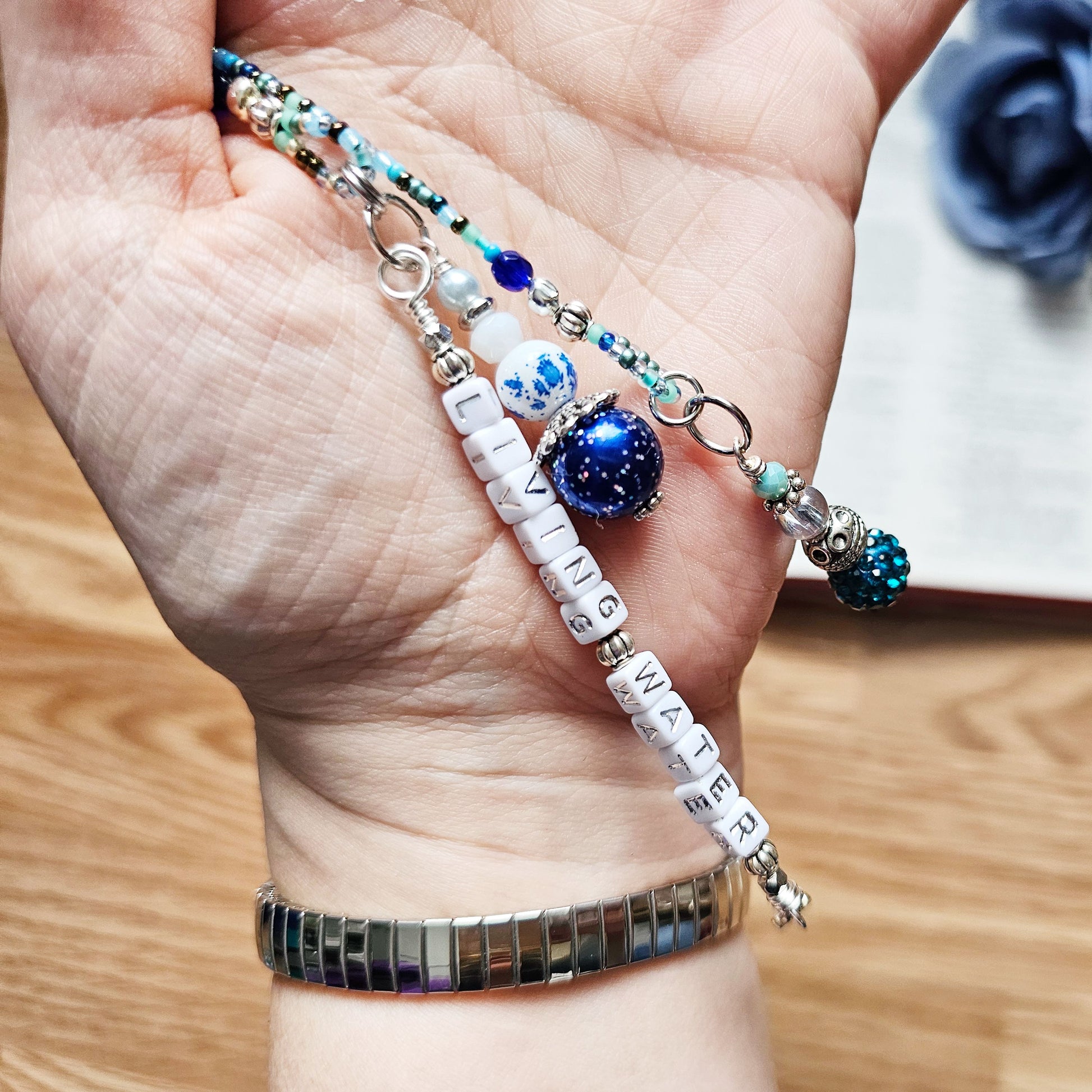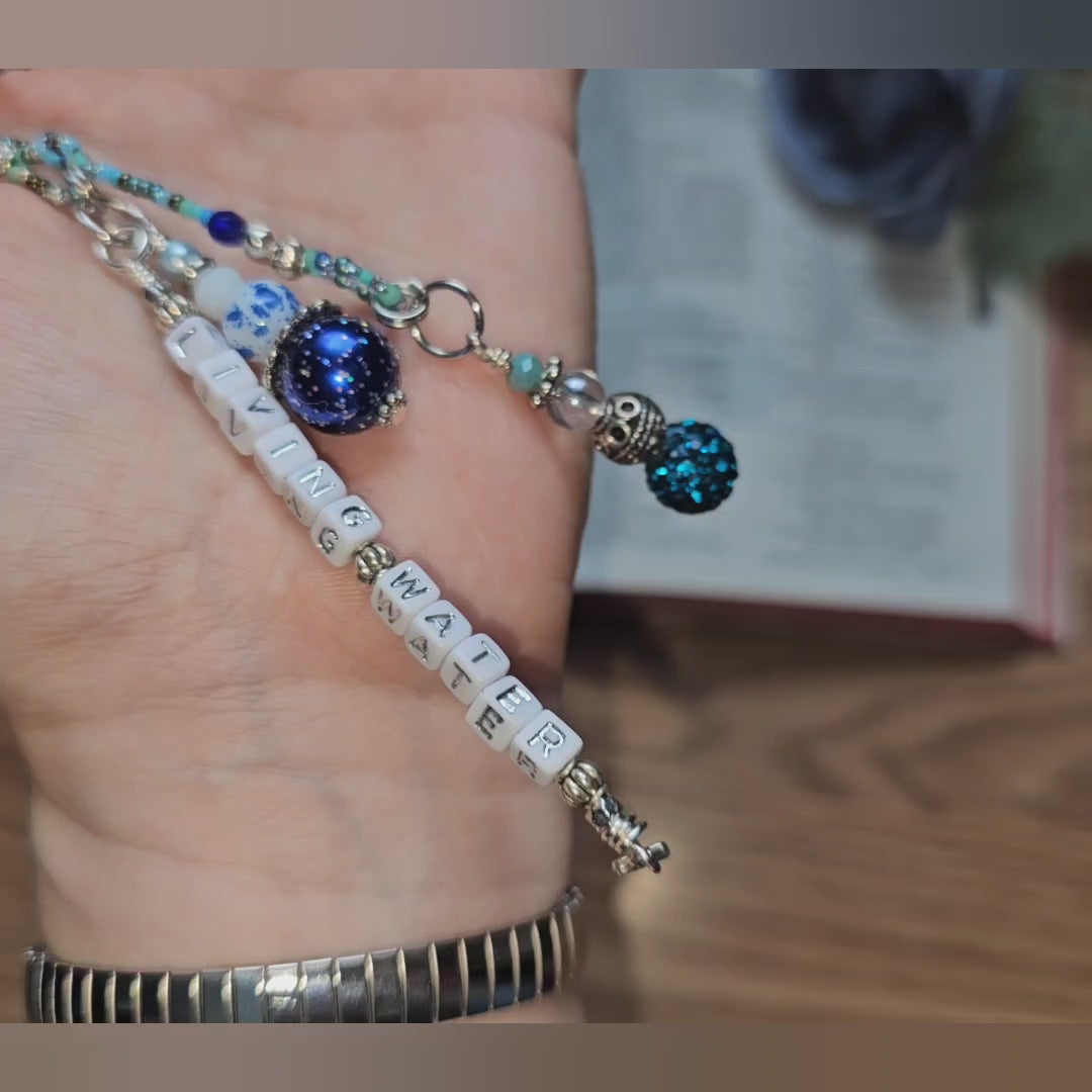 ♥ The word charm reads Living Water with white acrylic beads and silver lettering. The strands are made of a mix of blues, turquoise, and silver Czech Glass seed beads, and the charms are a mix of glass beads, silver beads, charms, and silver wire. The findings are all silver.