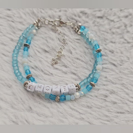 This 2-strand bracelet features the word CHOSEN in 4.5mm white acrylic cube letter beads with silver lettering, matte baby blue glass seed beads, silver beads, and Czech glass. There is a 1" extender chain with a petite silver cross at the end. Wear this one-of-a-kind piece of jewelry with a dress, or jeans and a tee.