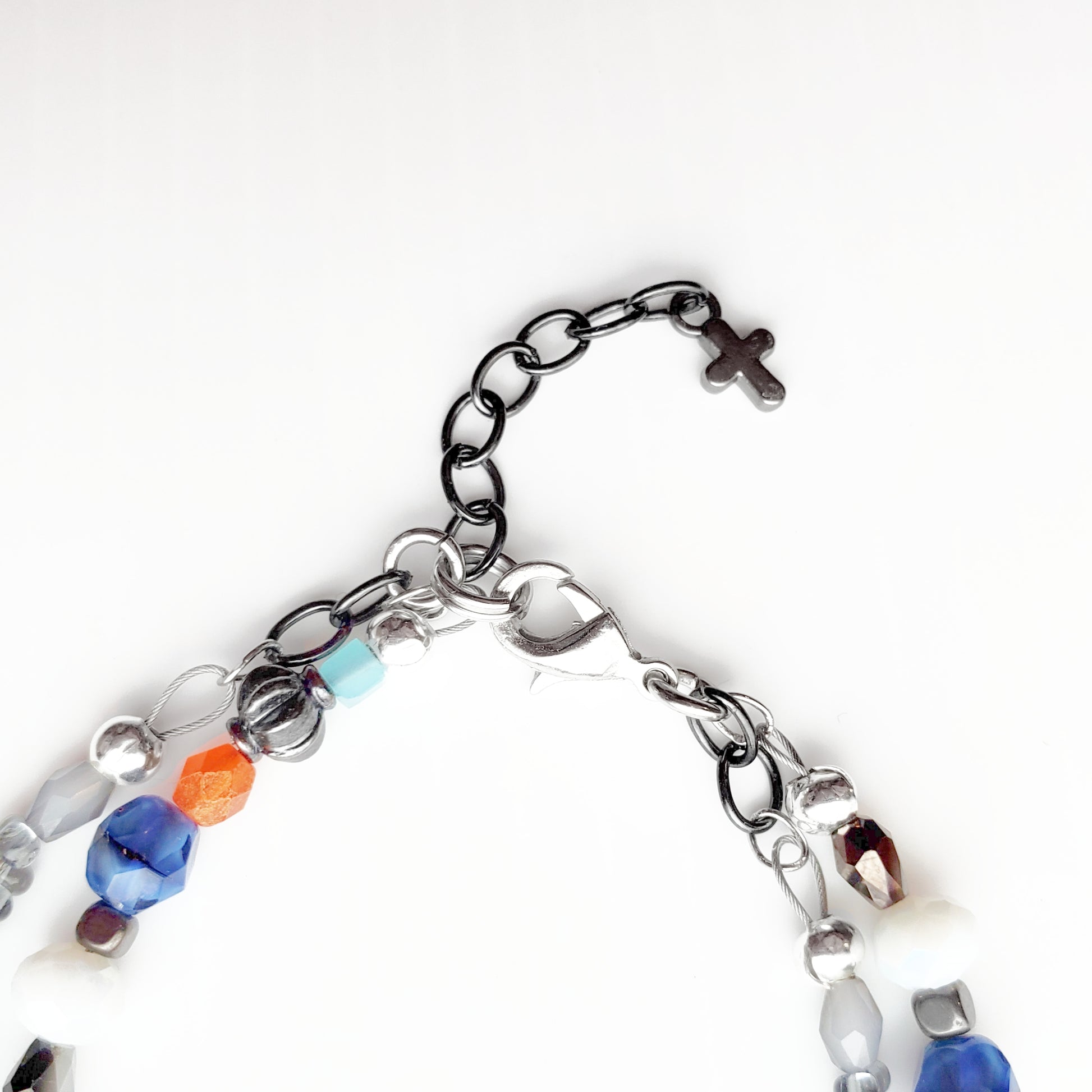→ Made with gunmetal chain, glass beads (silver, orange, black, shades of blue, and white), gray glass beads, acrylic alpha beads, and prayer.