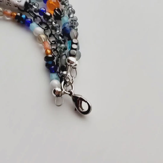 → Made with gunmetal chain, glass beads (silver, orange, black, shades of blue, and white), gray glass beads, acrylic alpha beads, and prayer.