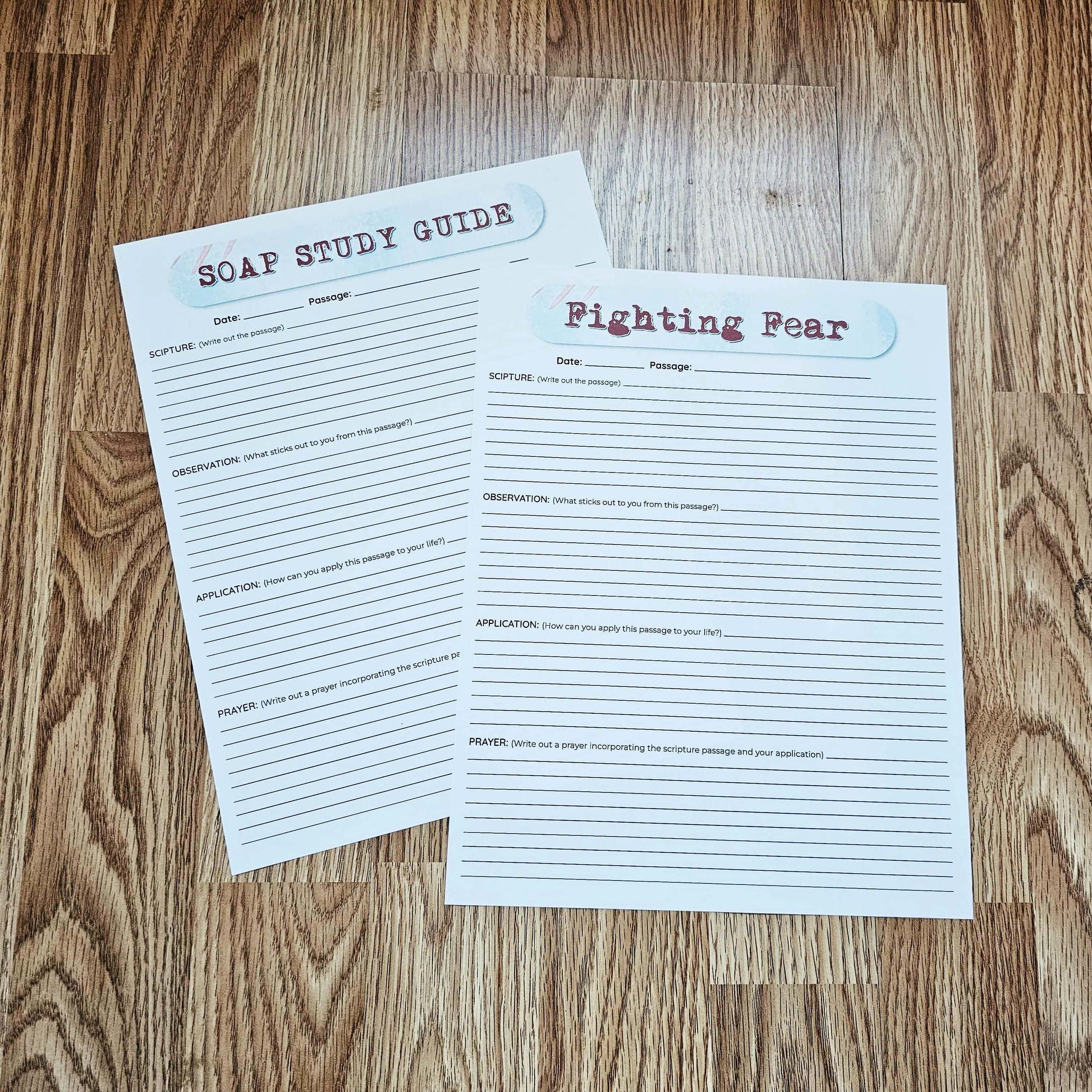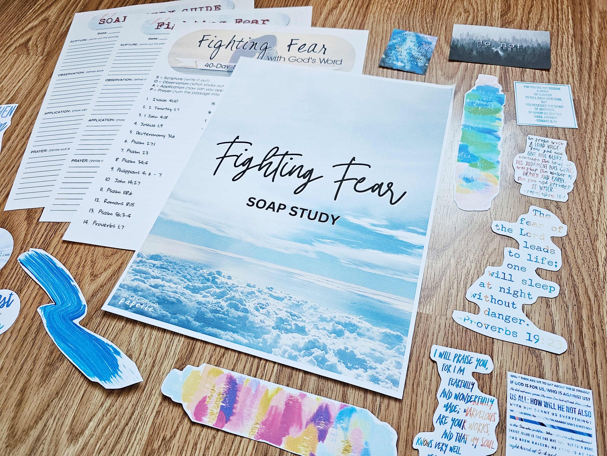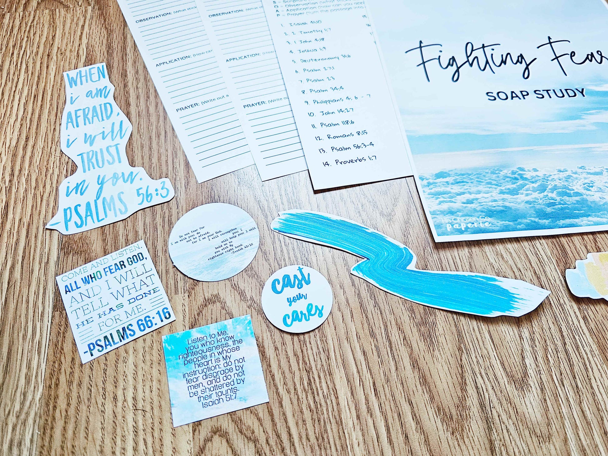 Your study pack includes the HisChosenCo Fighting Fear study guide, 40 printed SOAP study sheets you fill out as you're studying, a cover page, a resource page, and a pack of 10 stickers. → Get the gals together and study in a group!