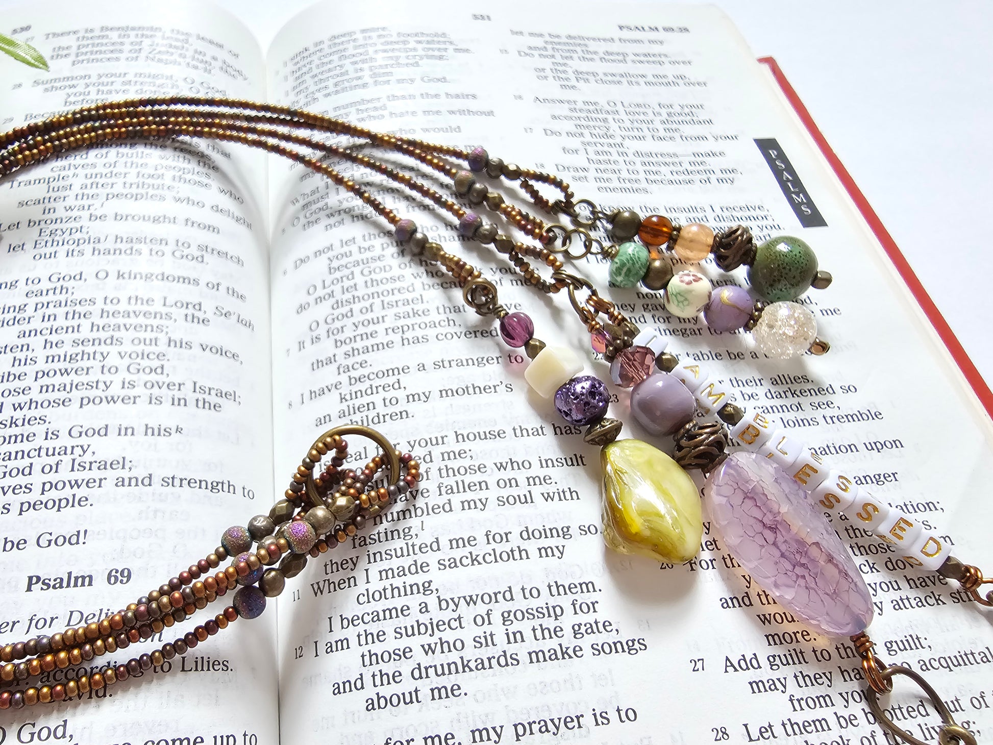 A new decorative beaded bookmark to hold your reading spots (in your bible or other books), while also reminding you of who you are in Christ - Blessed!
