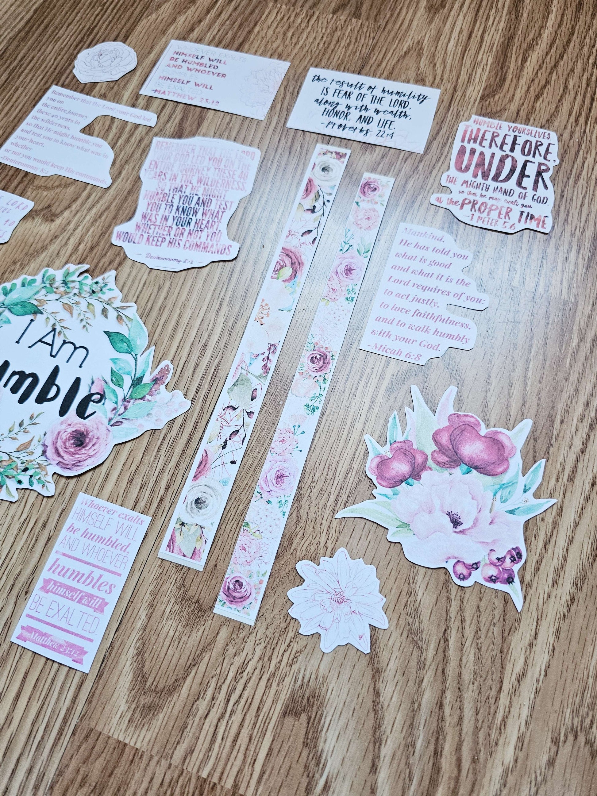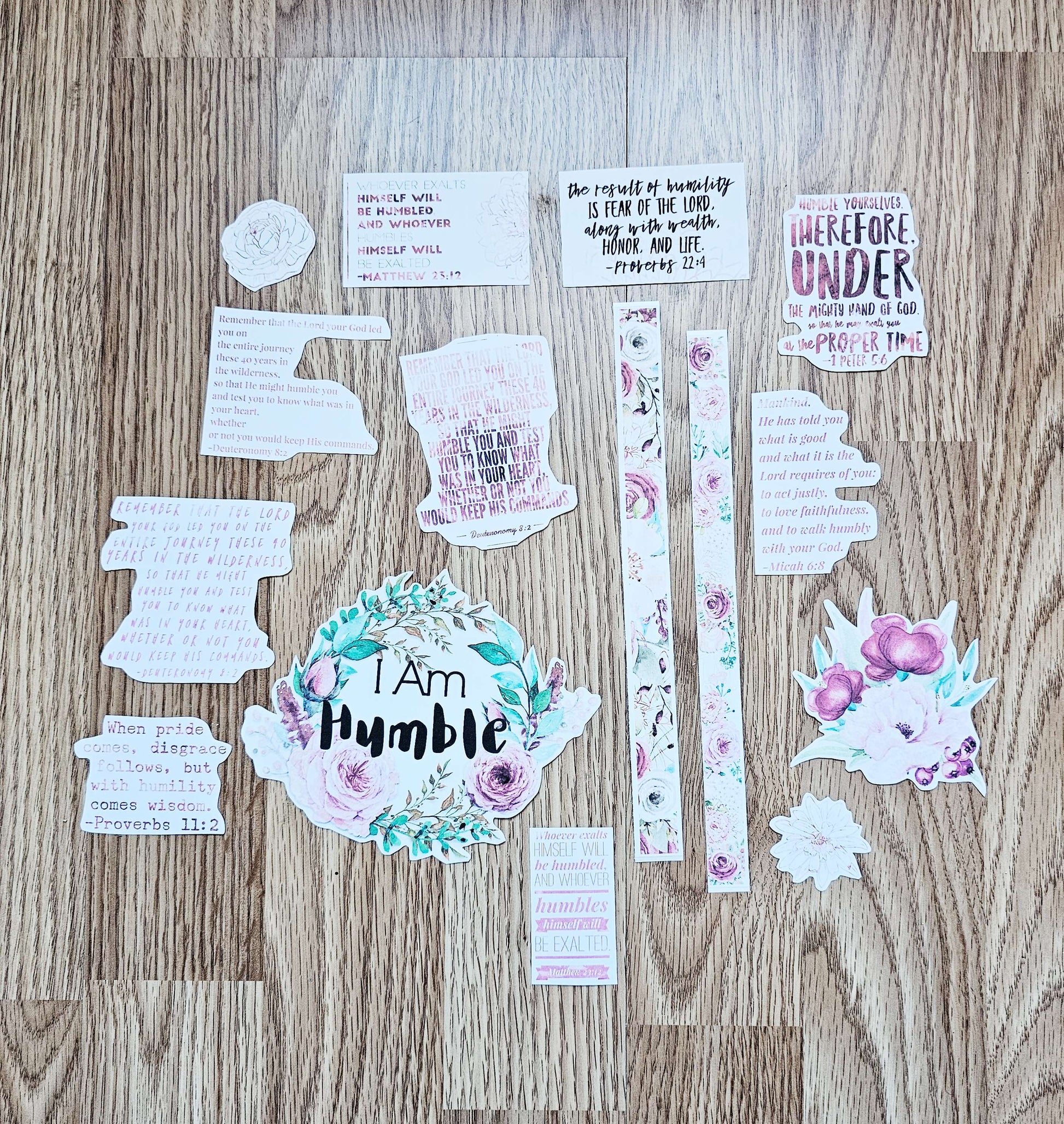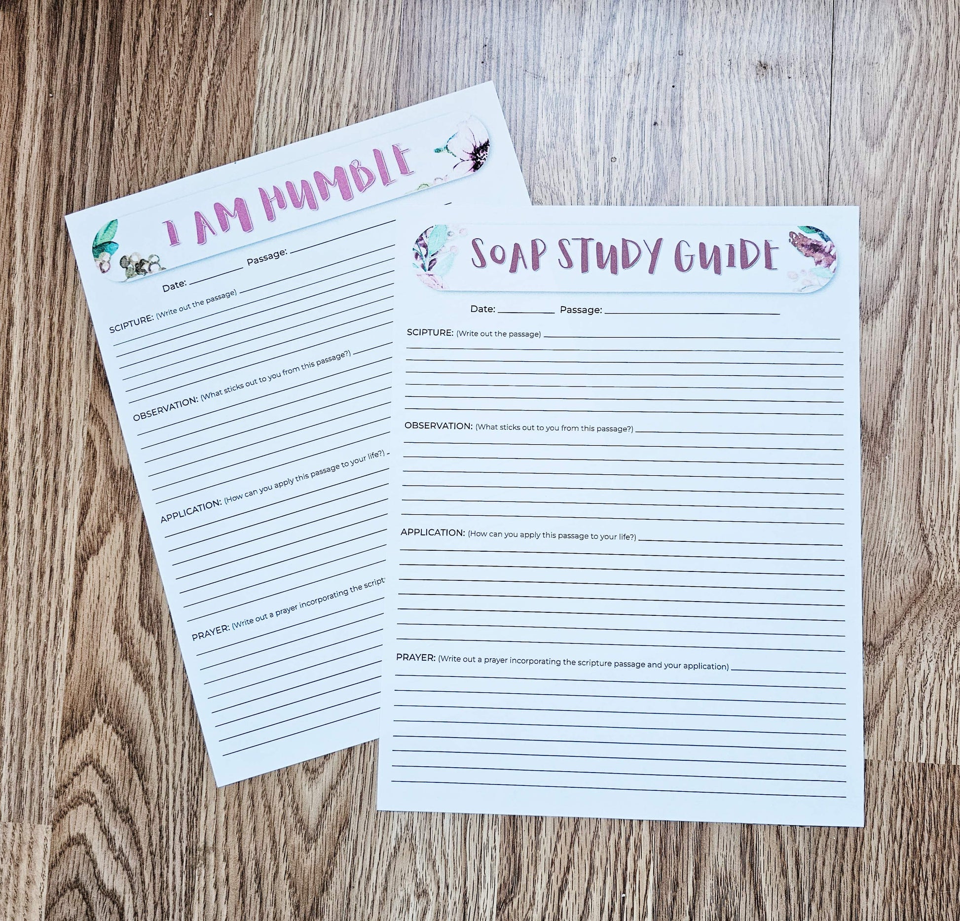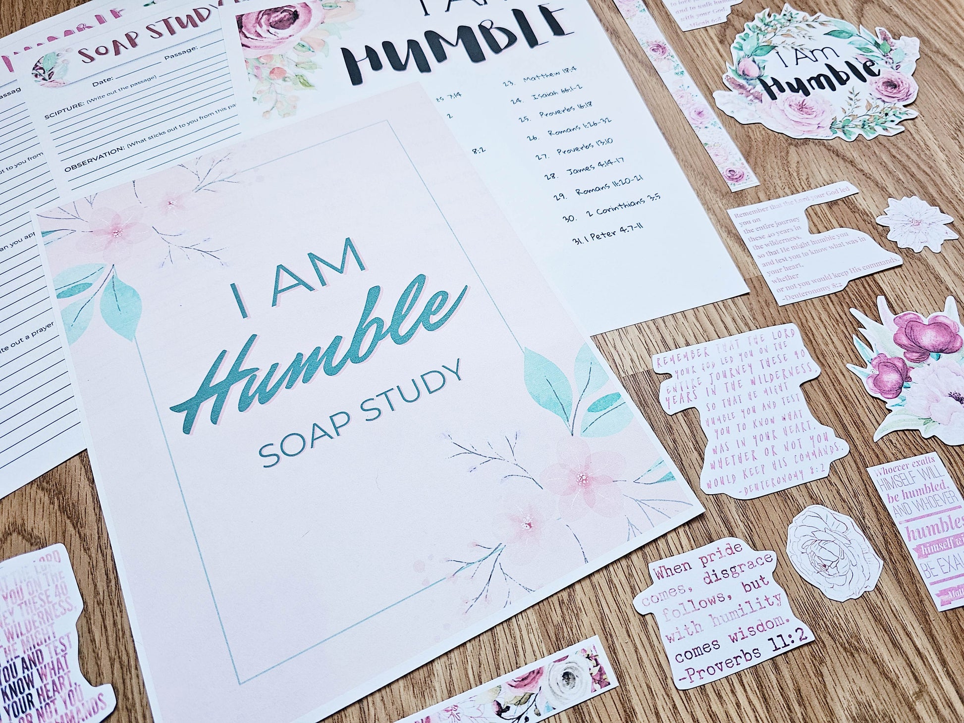 Your study pack includes the HisChosenCo I Am Humble study guide, 40 printed SOAP study sheets you fill out as you're studying, a cover page, a resource page, and a pack of 10 stickers. → Get the gals together and study in a group!