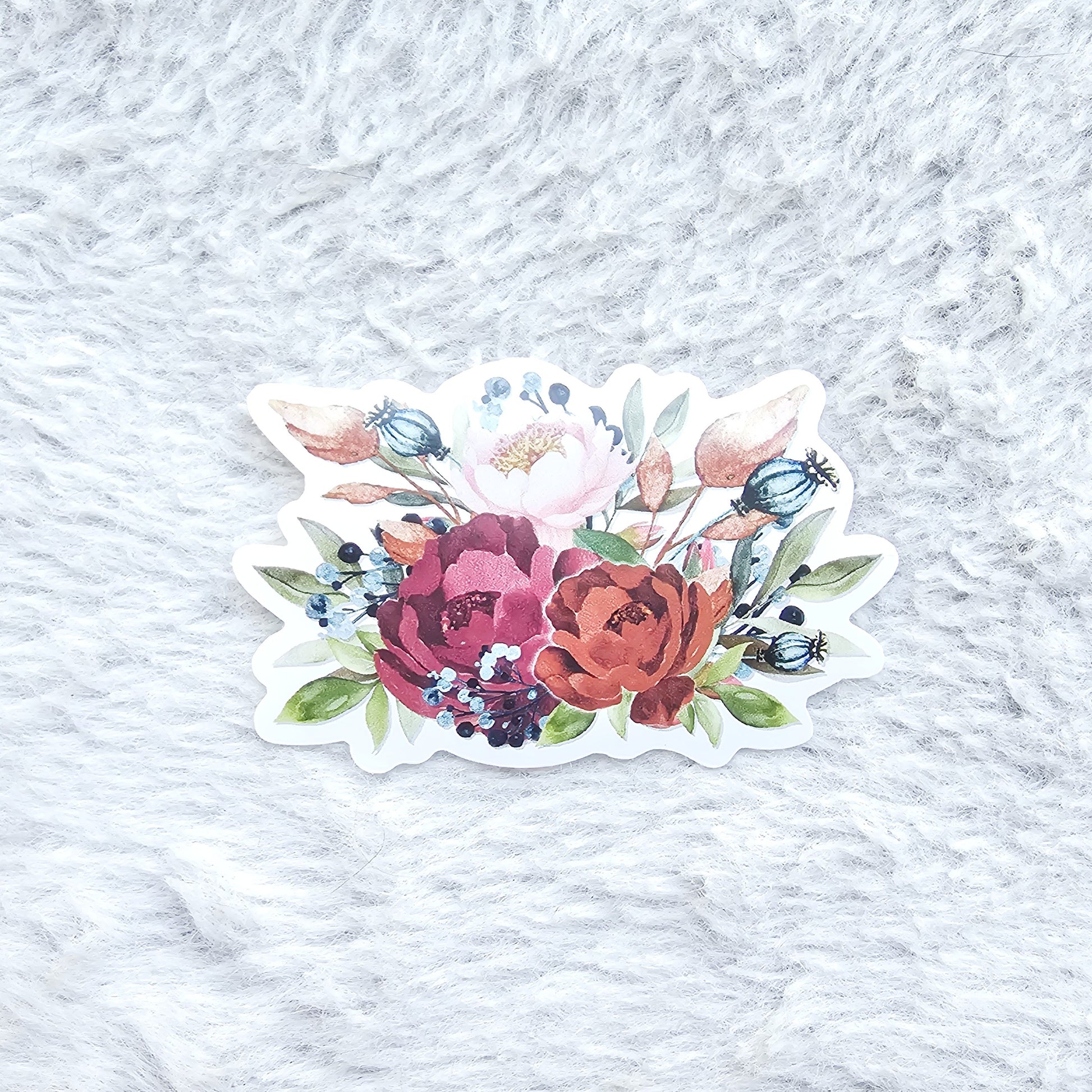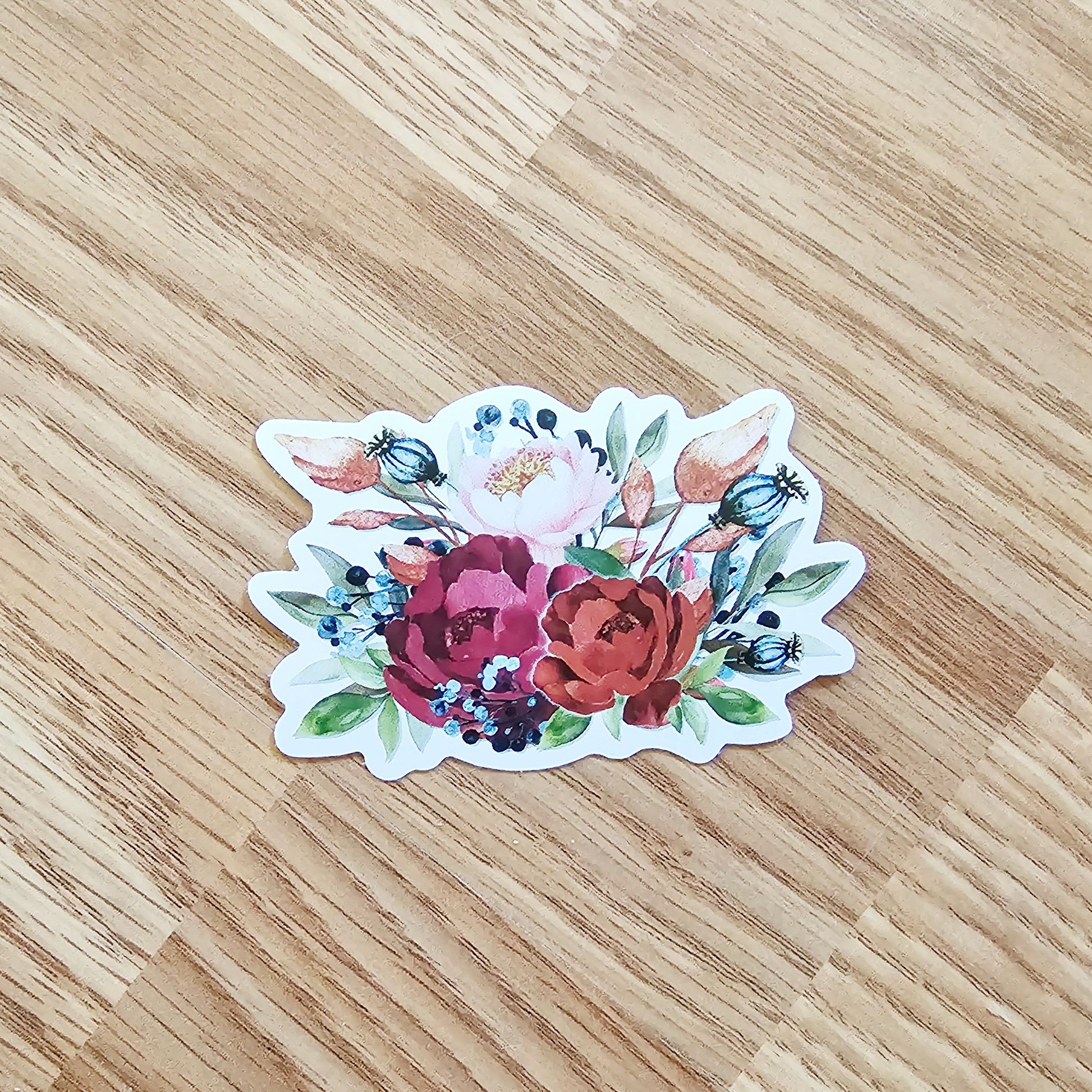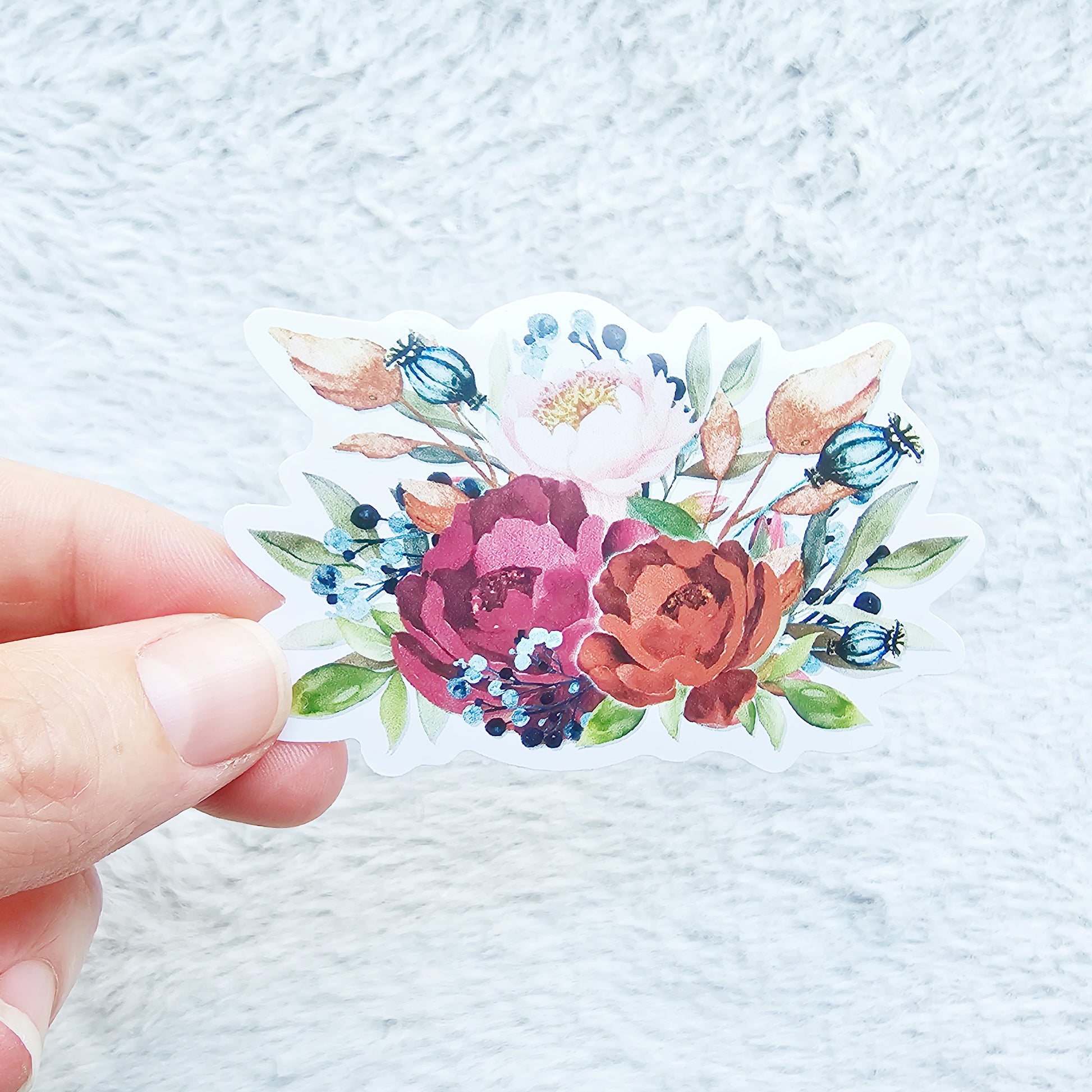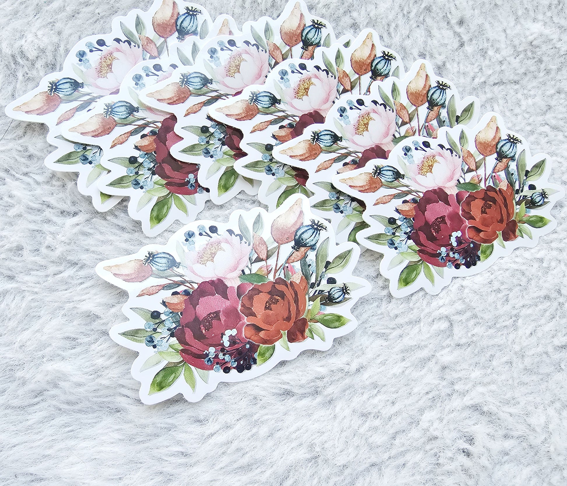 These stickers have a white background, they're made of waterproof vinyl, and the longest side is 3".