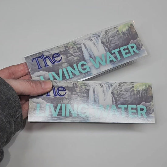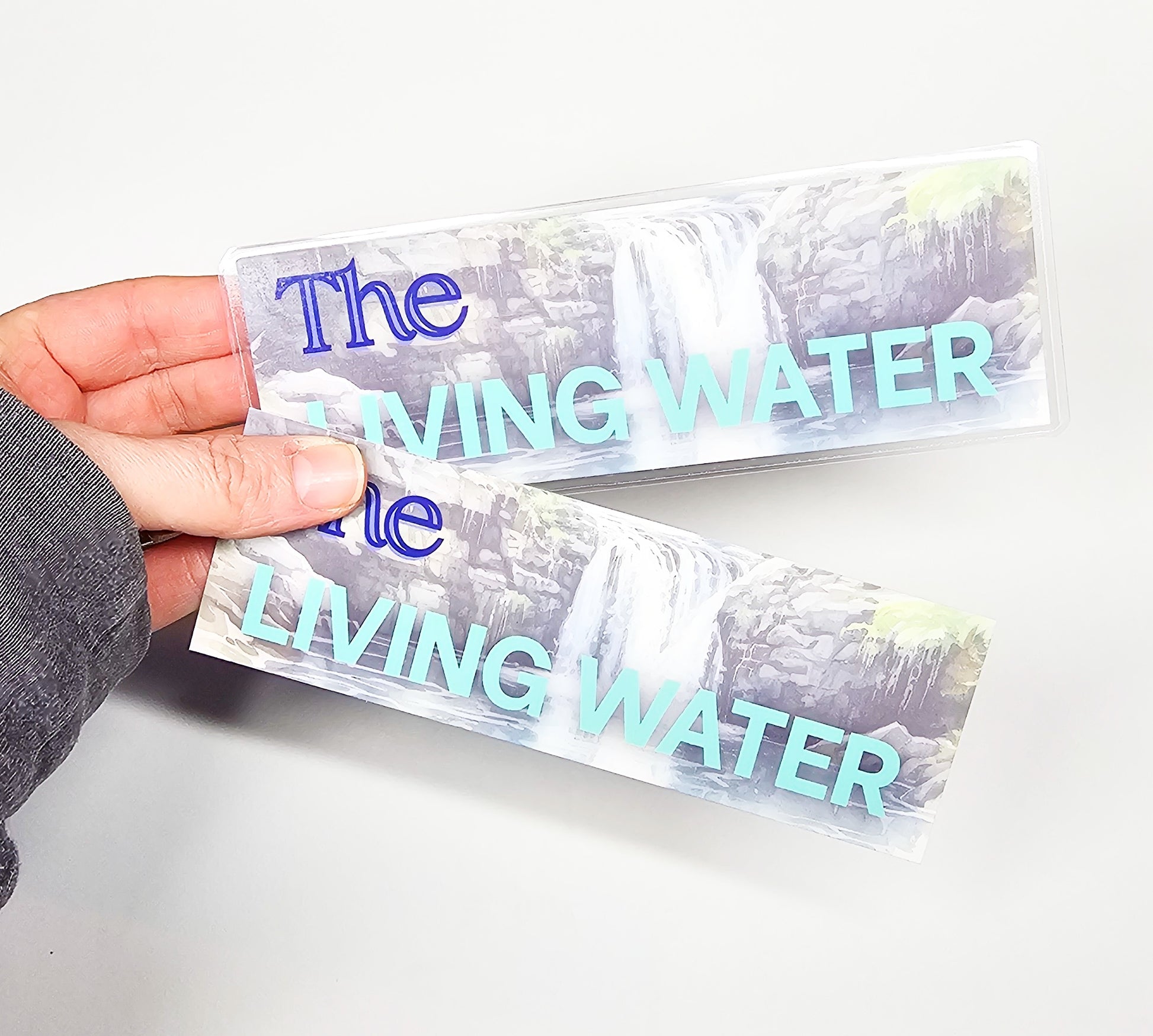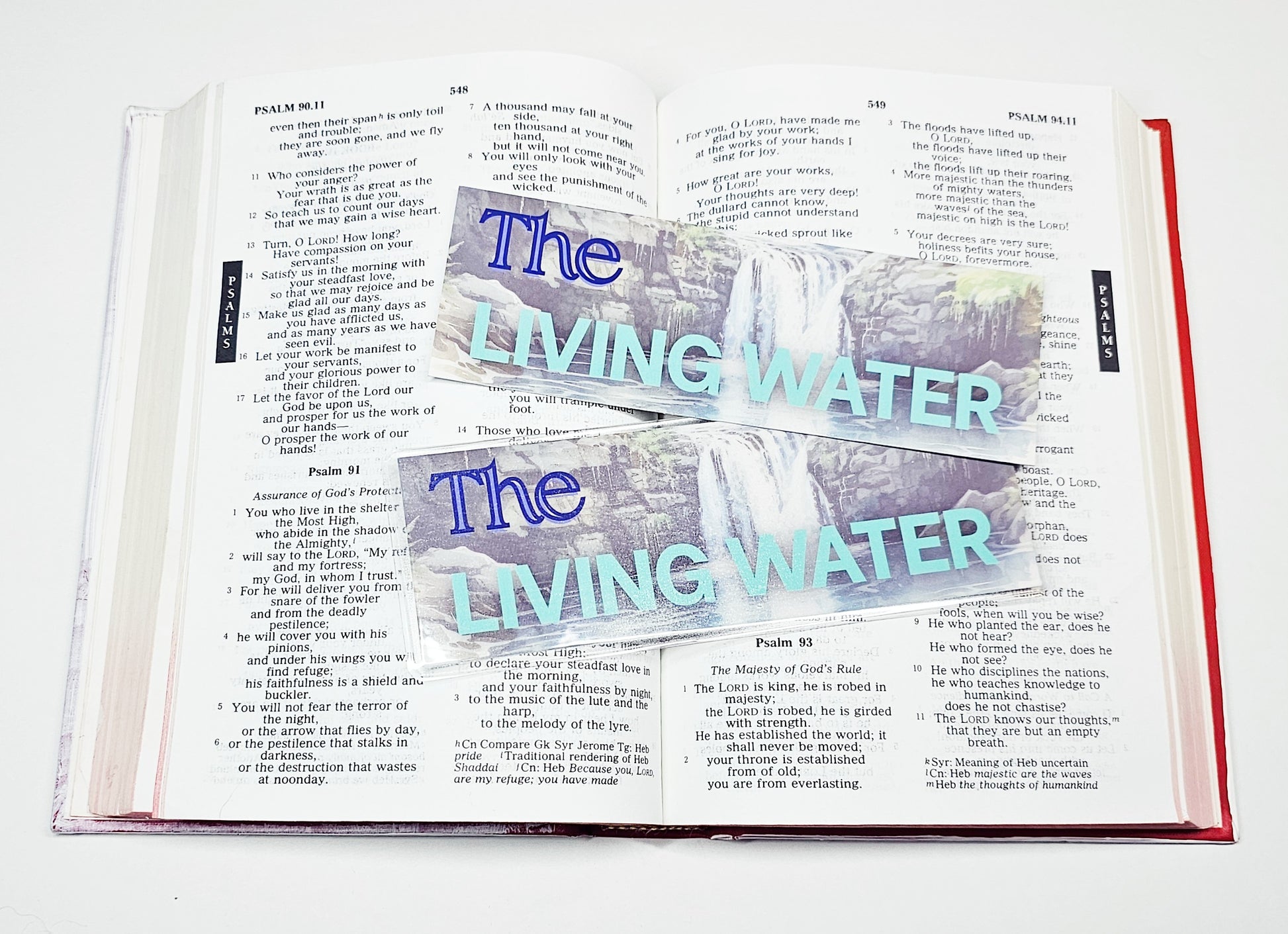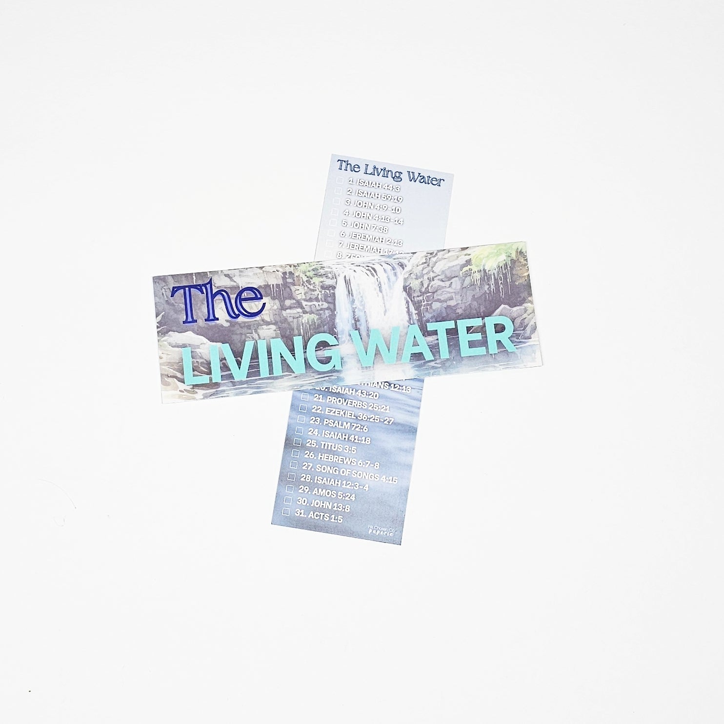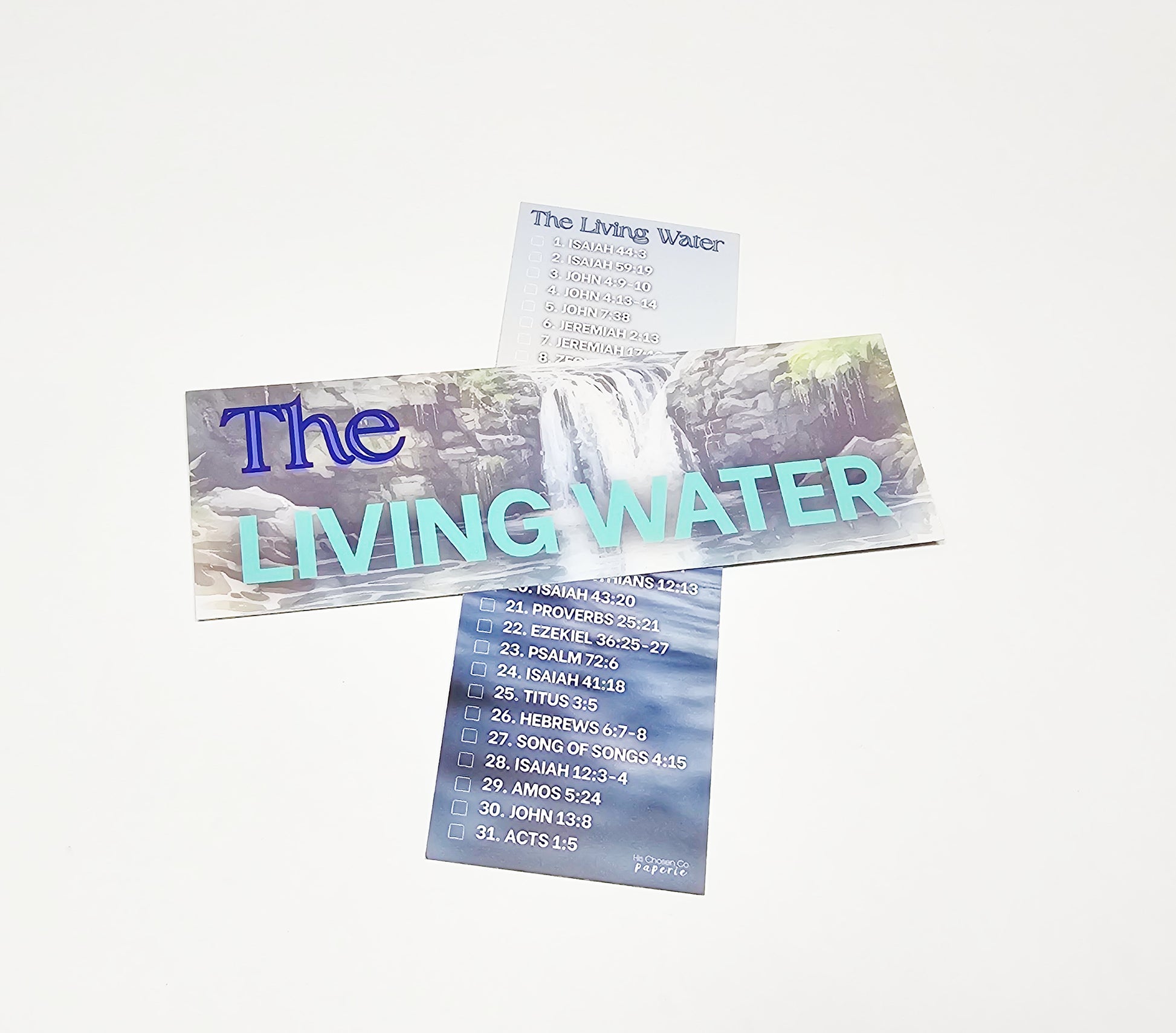 This 2" x 6" cardstock bookmark features the statement 'The Living Water' with beautiful watercolor waterfall designs on one side, and 31 bible study prompts on the other side with checkboxes so you know where you left off.