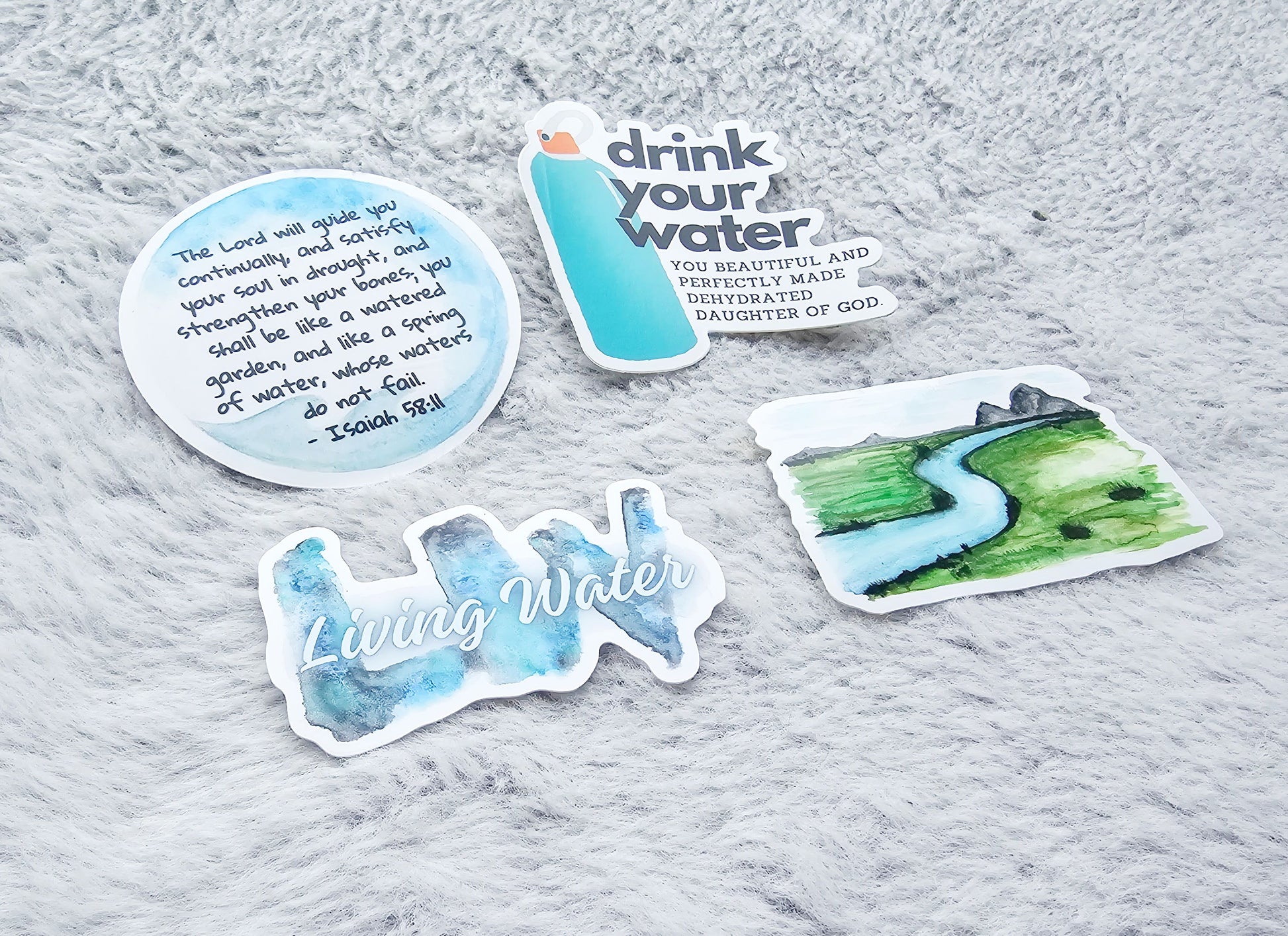 This listing is for the Living Water Vinyl Sticker Set of 4 from The Living Water collection from HisChosenCo Paperie. These stickers are useful for many things - perfect for your laptop cover, tumbler, notebook, journal, scrapbooking, junk journaling, or phone case! The possibilities are nearly endless, friend!