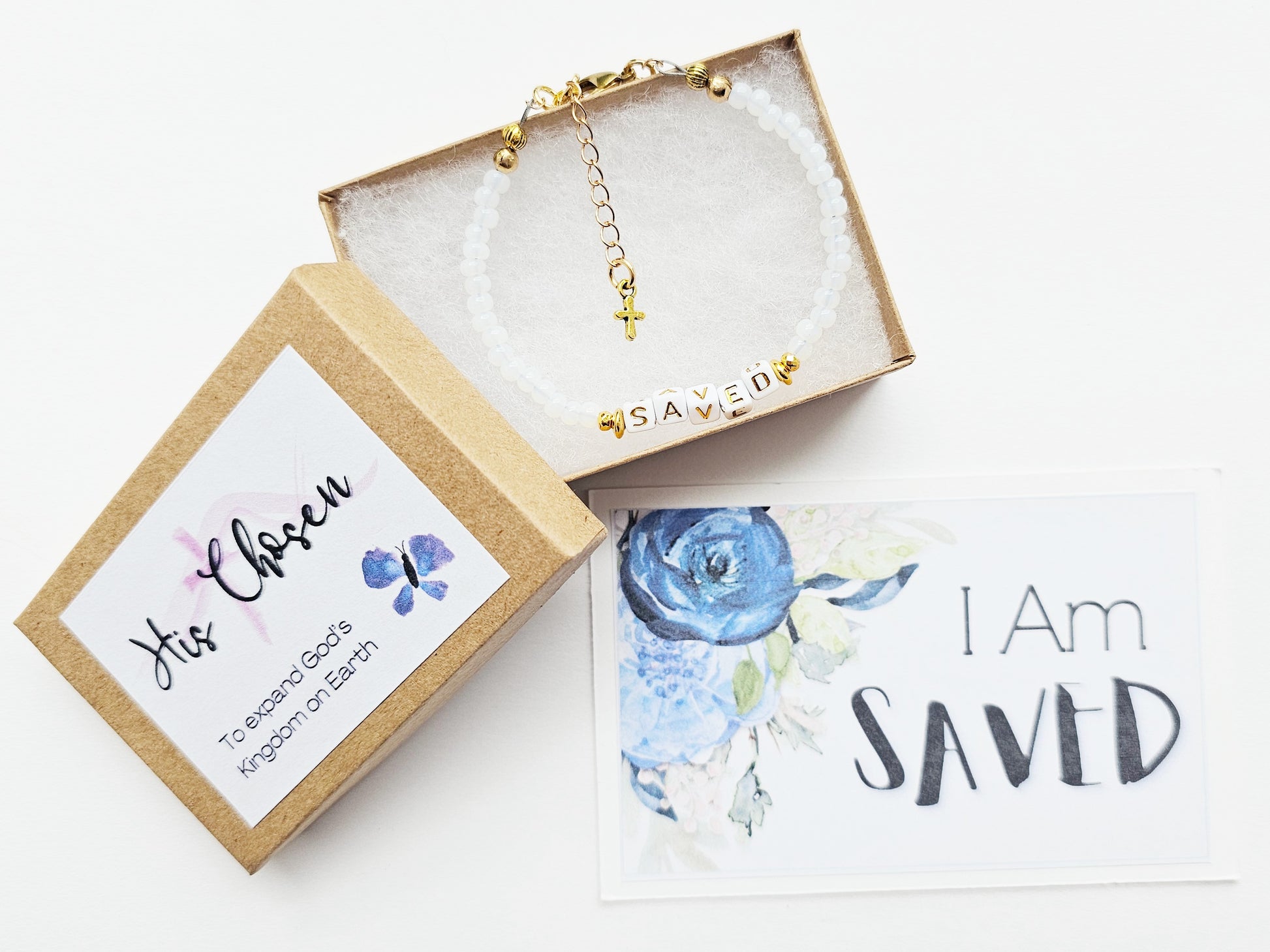 → Made with white glass seed beads, gold spacers, acrylic alpha beads, and prayer.